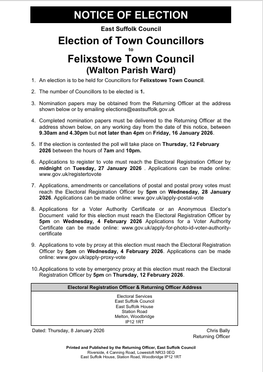 Read moreAn Election is to be held on Tuesday 12 February 2026 for one Councillor for the Walton Parish Ward. Please see the Notice below for details. Notice of Election – Felixstowe – 12 Feb 2026
