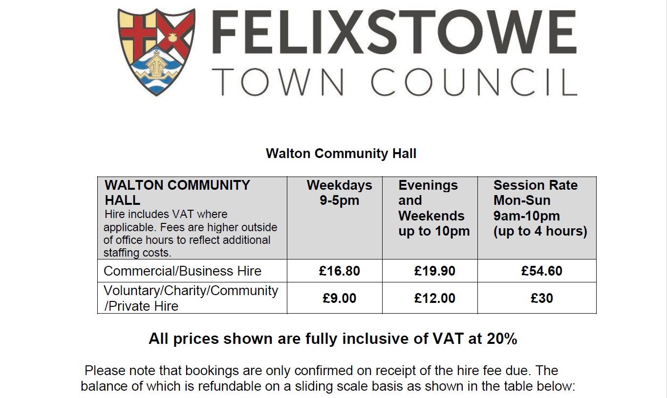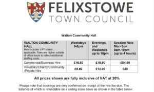 To make a booking, or for further information please contact Sarah Morrison on 01394 288194 or email sarah.morrison@felixstowe.gov.uk