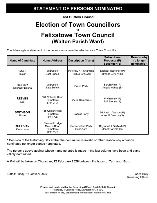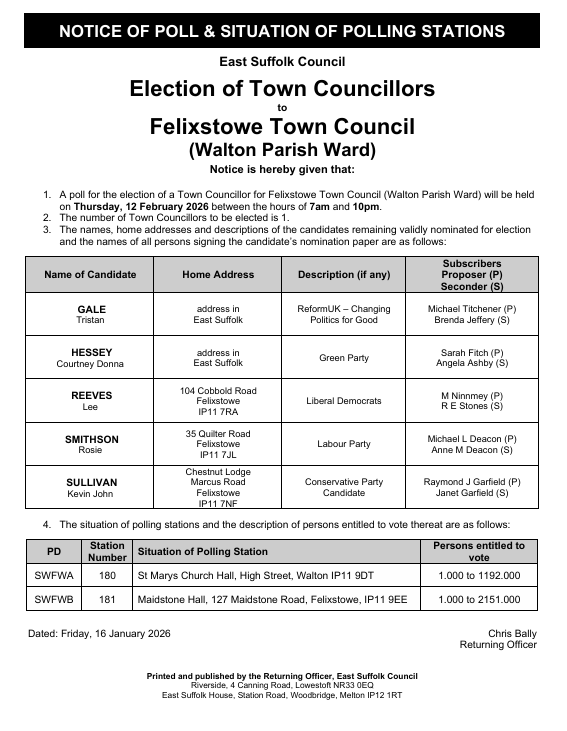 The Notice of Poll  and the Statement of Persons Nominated for the election to Walton Parish Ward on Thursday 12 February 2026 has been published.