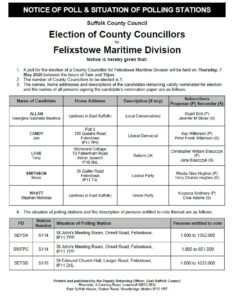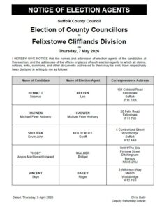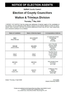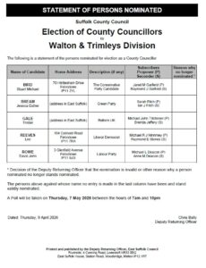 The Notice of Poll and the Statement of Persons Nominated for the Suffolk County Council election to the divisions of Clifflands, Maritime and Walton & Trimleys on Thursday 7 May 2026 have been published.